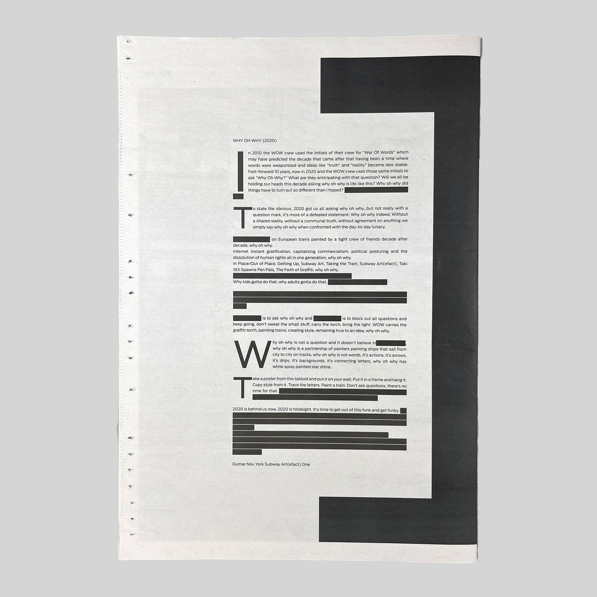 The publication War of Words was published 10 years ago to celebrate the 20 year anniversary of graffiti crew WOW. This publication, a time-capsule printed in newspaper format - matching the characteristics of the subject, graffiti - found great demand. A limited edition only of 400 copies found its way worldwide easy and was gone in a couple of days. A video promoting and stressing the exclusivity of the project helped spreading the word.